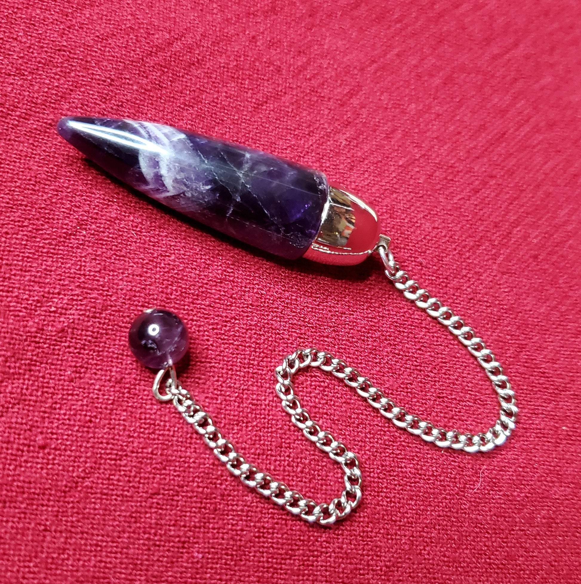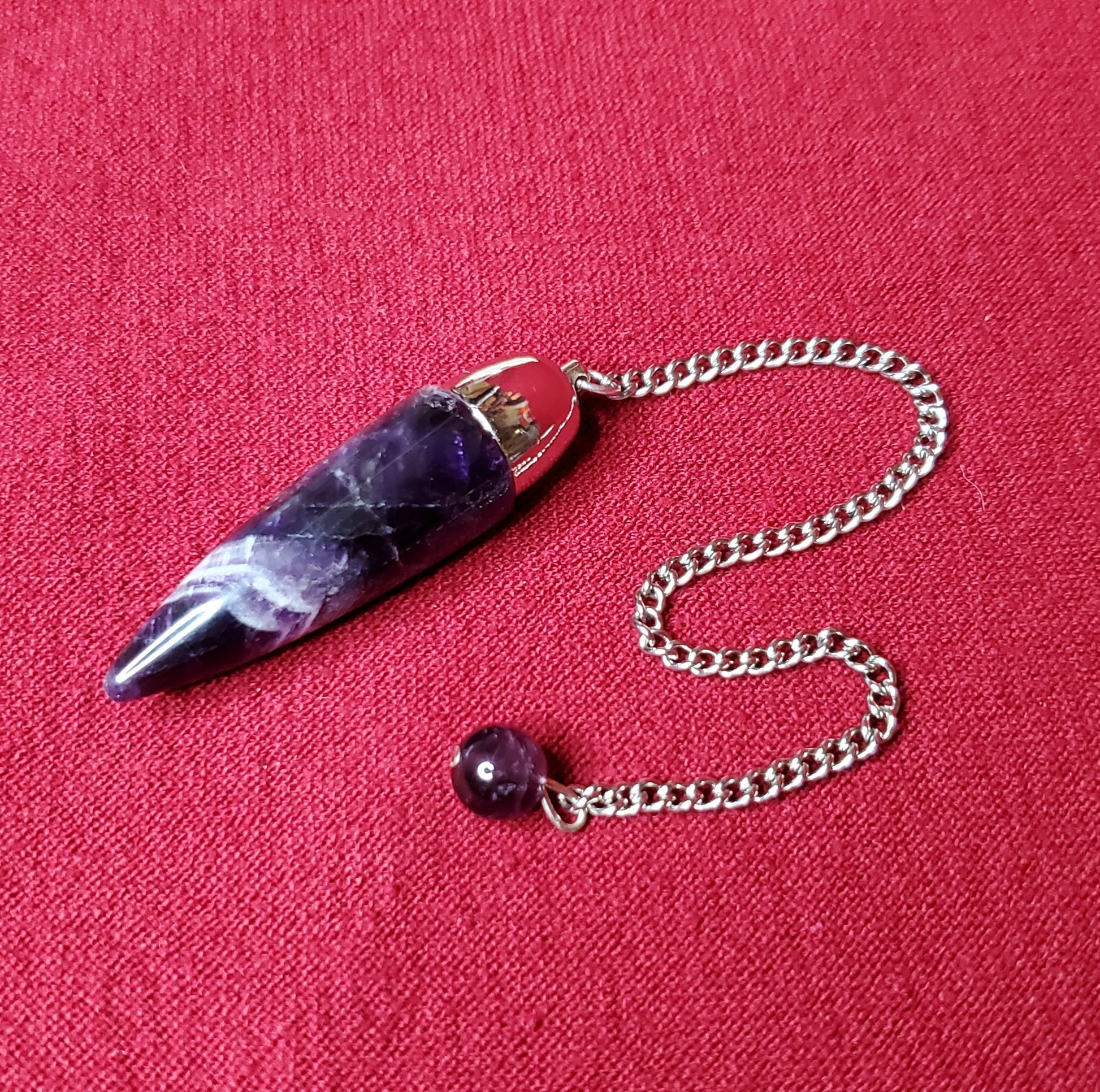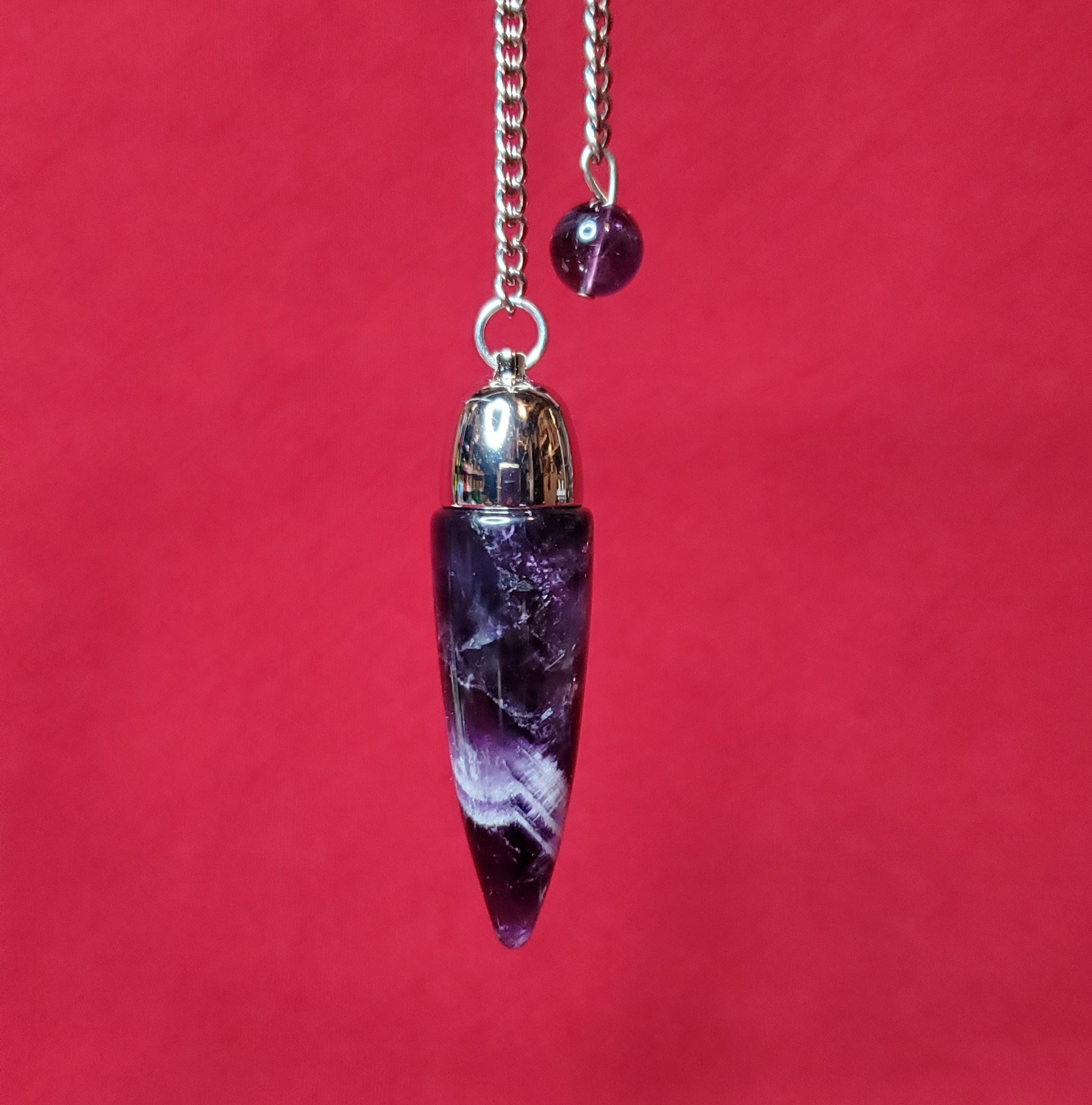 Brazilian Amethyst topped with a surgical grade stainless steel dome and sgss chain. Perfectly balanced and weighted. Amethyst is a stone of spiritual connection, protection, purification, cleansing as well as helping to eliminate bad habits and things that no longer serve us.