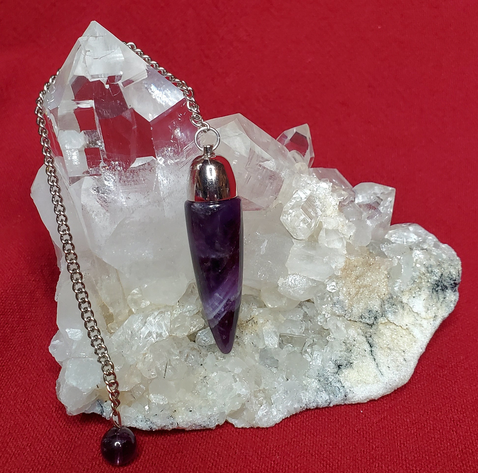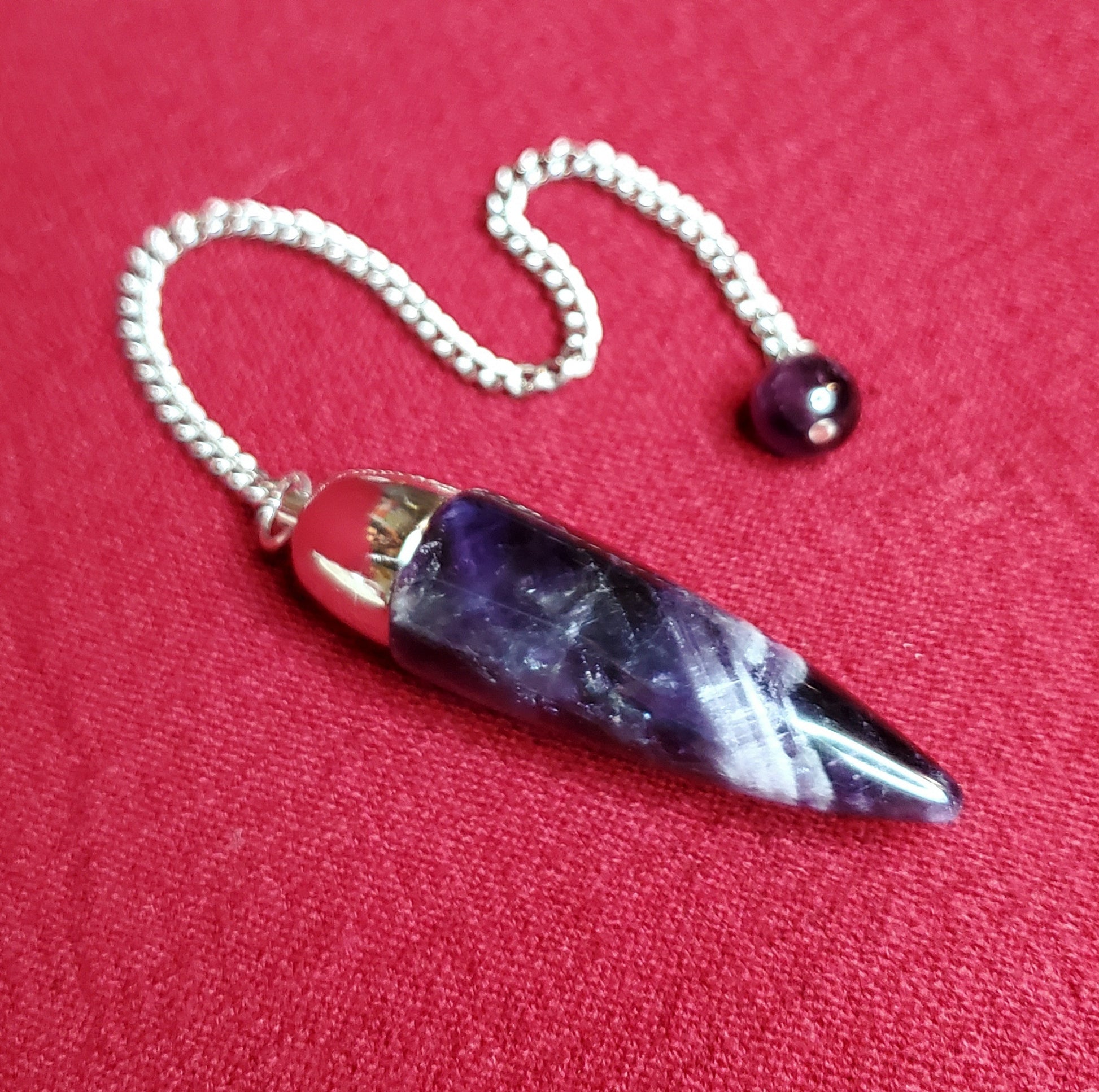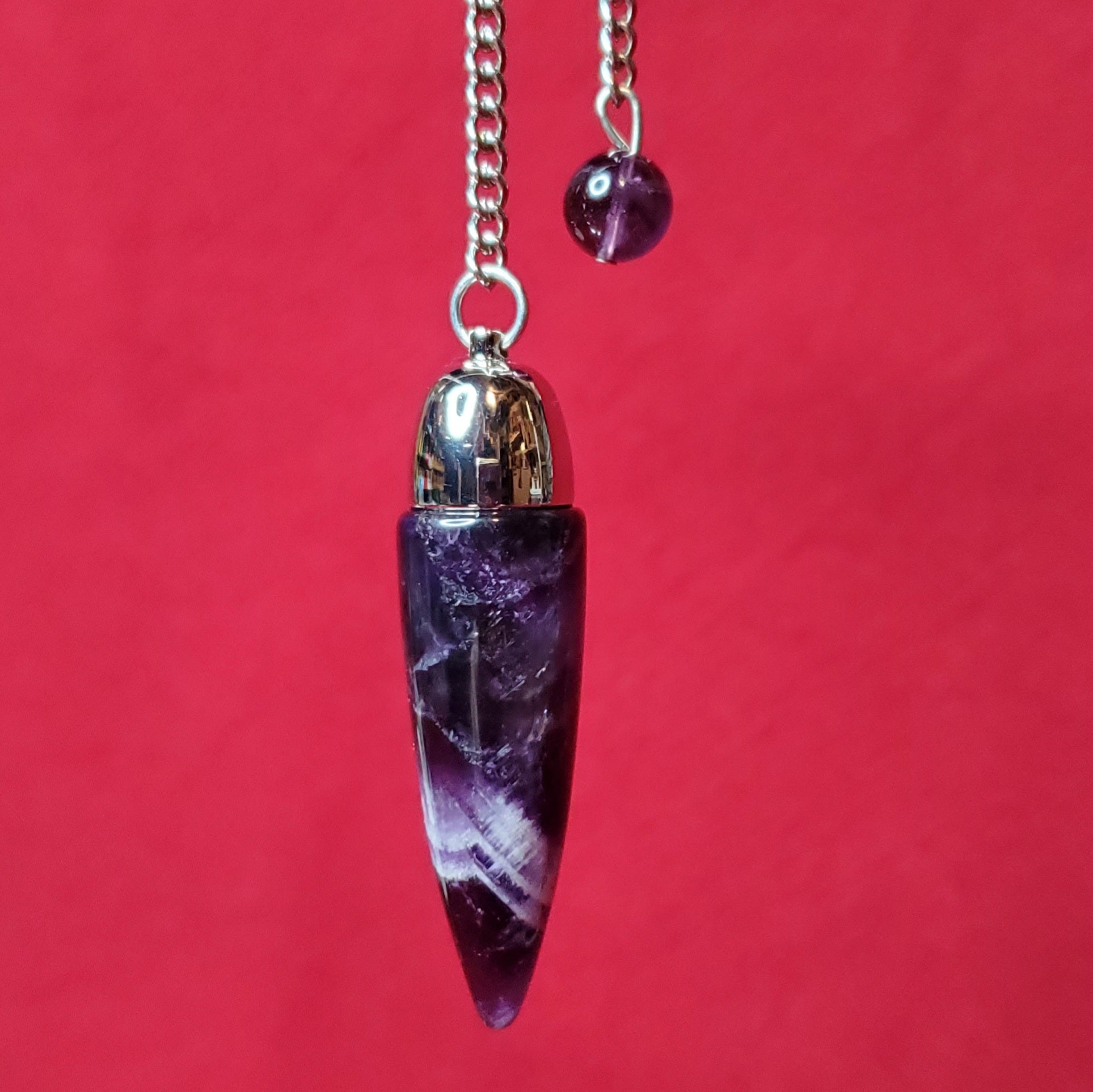 Brazilian Amethyst topped with a surgical grade stainless steel dome and sgss chain. Perfectly balanced and weighted. Amethyst is a stone of spiritual connection, protection, purification, cleansing as well as helping to eliminate bad habits and things that no longer serve us.