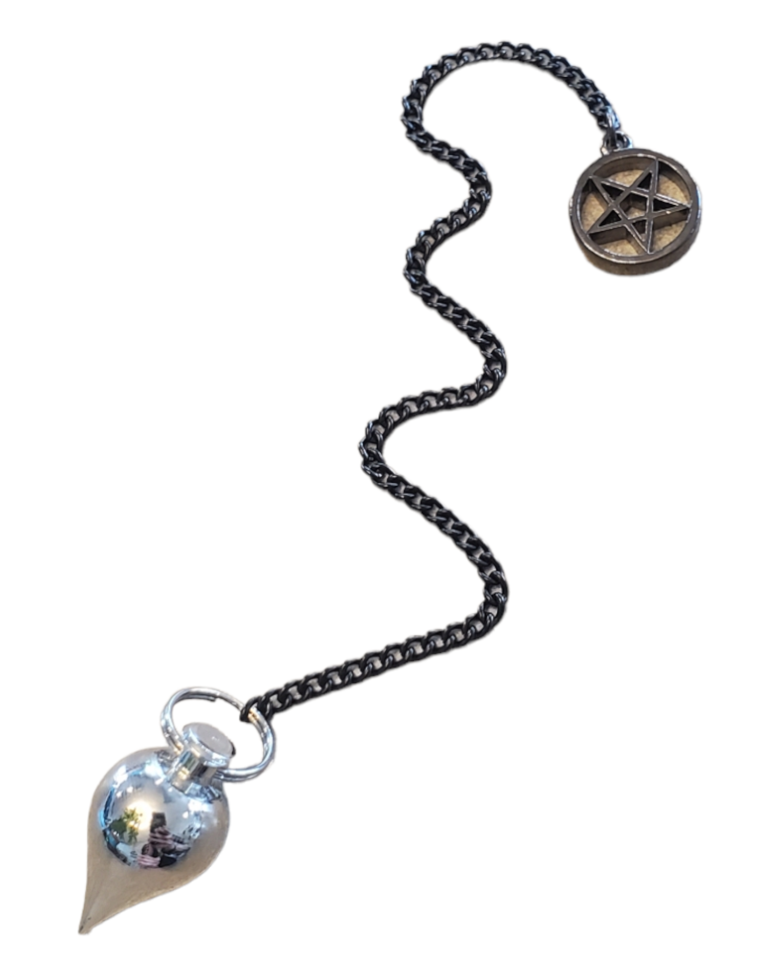 Our most popular C100 teardrop pendulum with a black curb chain and black Pentacle.