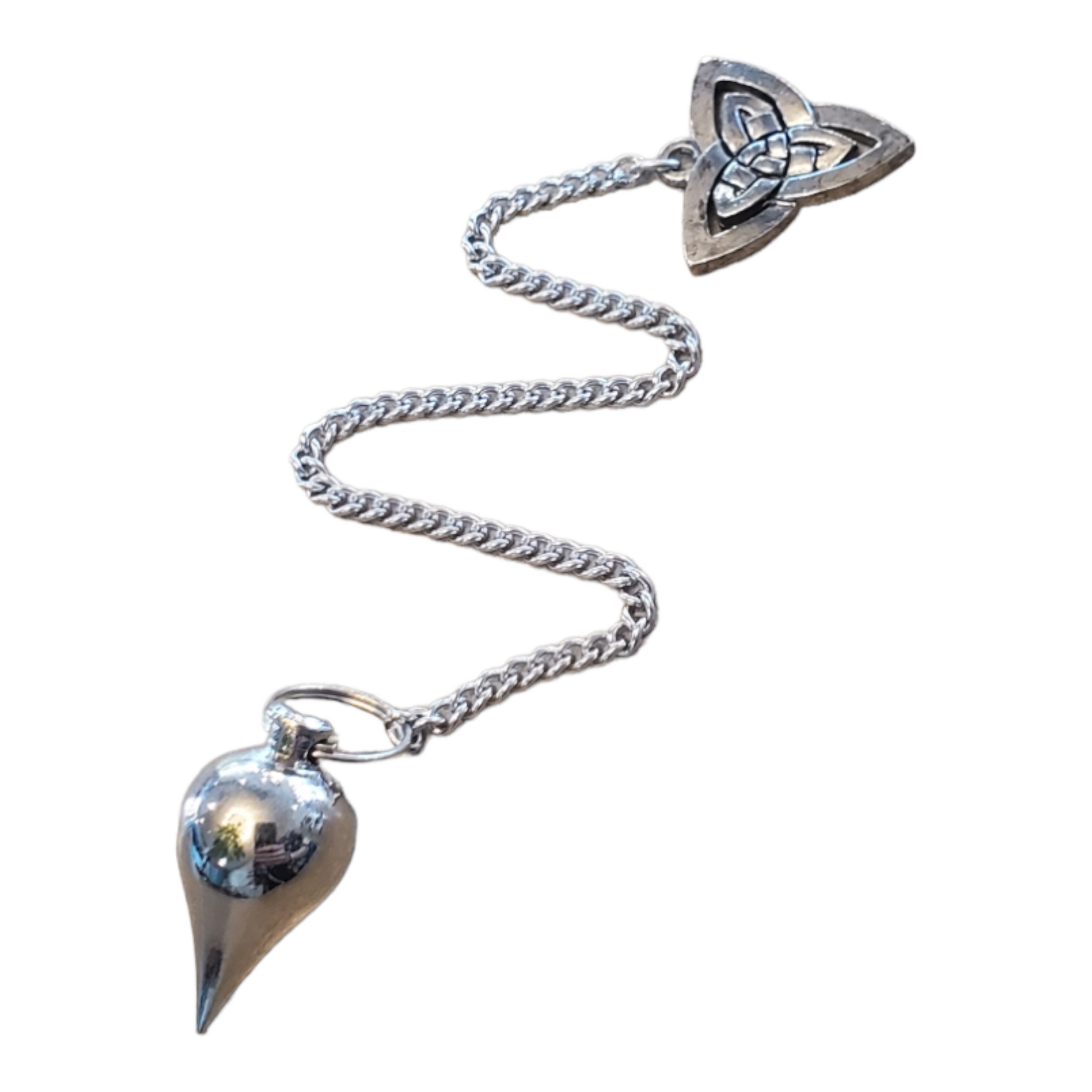 Our most popular C100 model teardrop pendulum on stainless steel curb chain with a classic Celtic Knot.