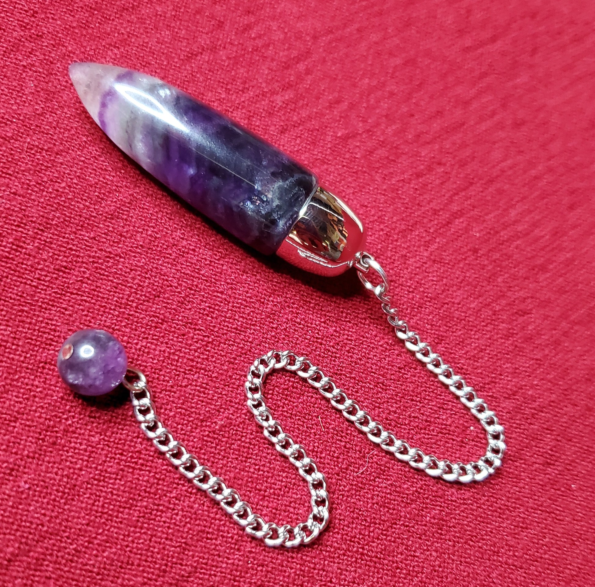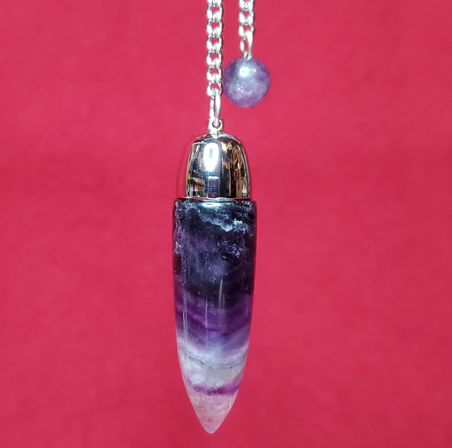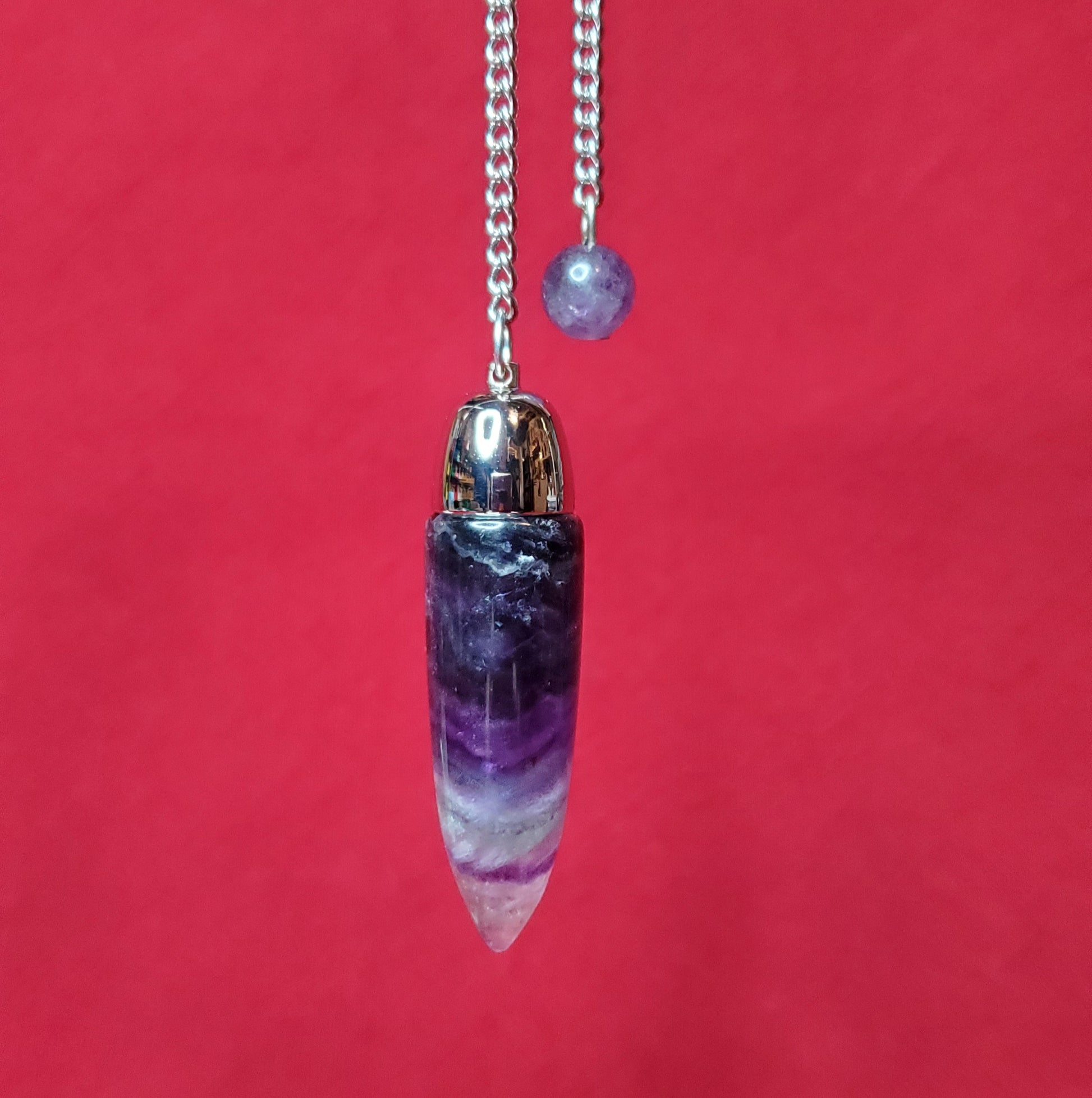 Rainboe Fluorite topped with a surgical grade stainless steel dome and sgss chain. Perfectly balanced and weighted. Fluorite is one of the best crystals for bringing order out of chaos, mental clarity and clearing out the energy field.