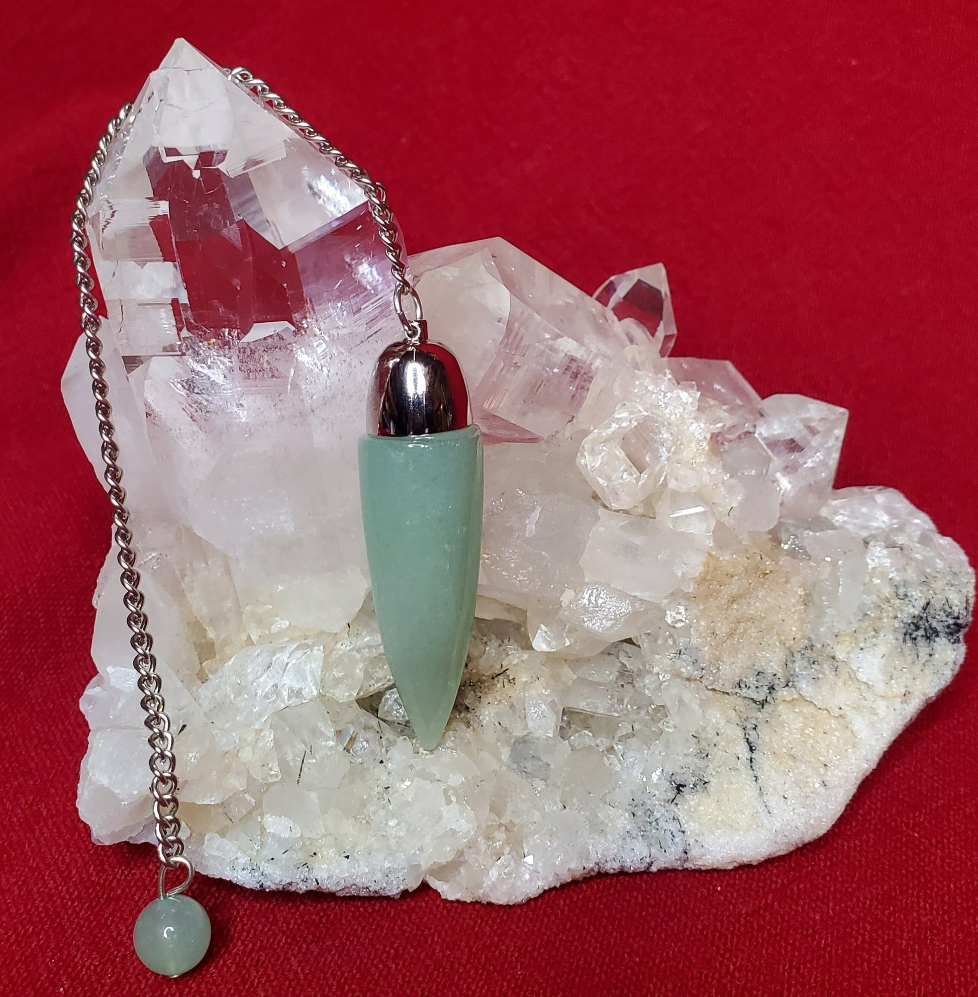 Green Aventurine topped with a surgical grade stainless steel dome and sgss chain. Perfectly balanced and weighted. Aventurine is similar to Jade not only in looks but energy as well, it is technically a Quartz but has an aura of good luck, health, wealth and prosperity. Great for increasing abundance!