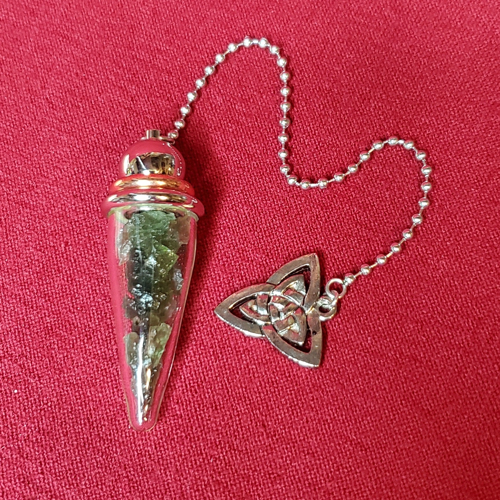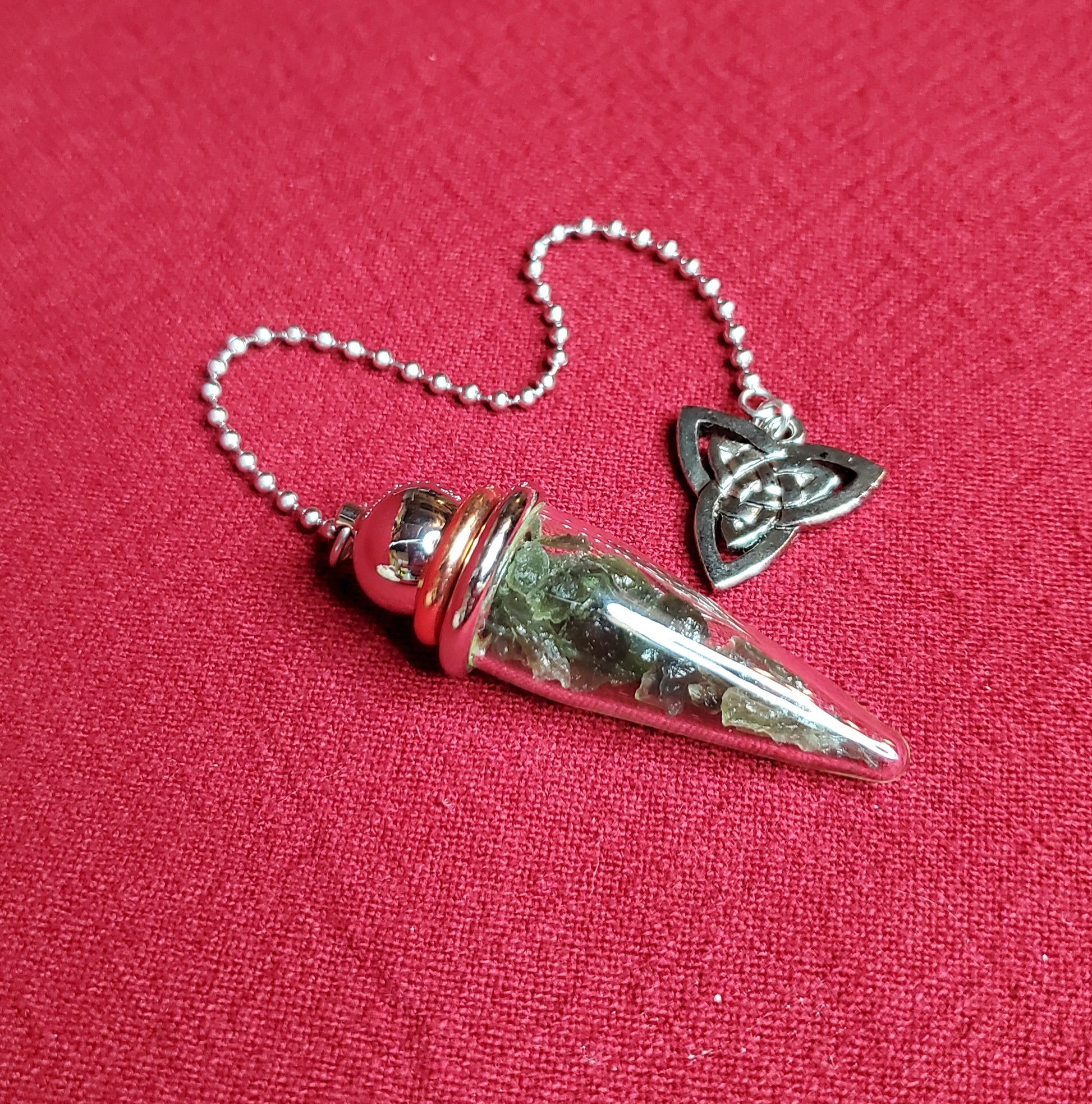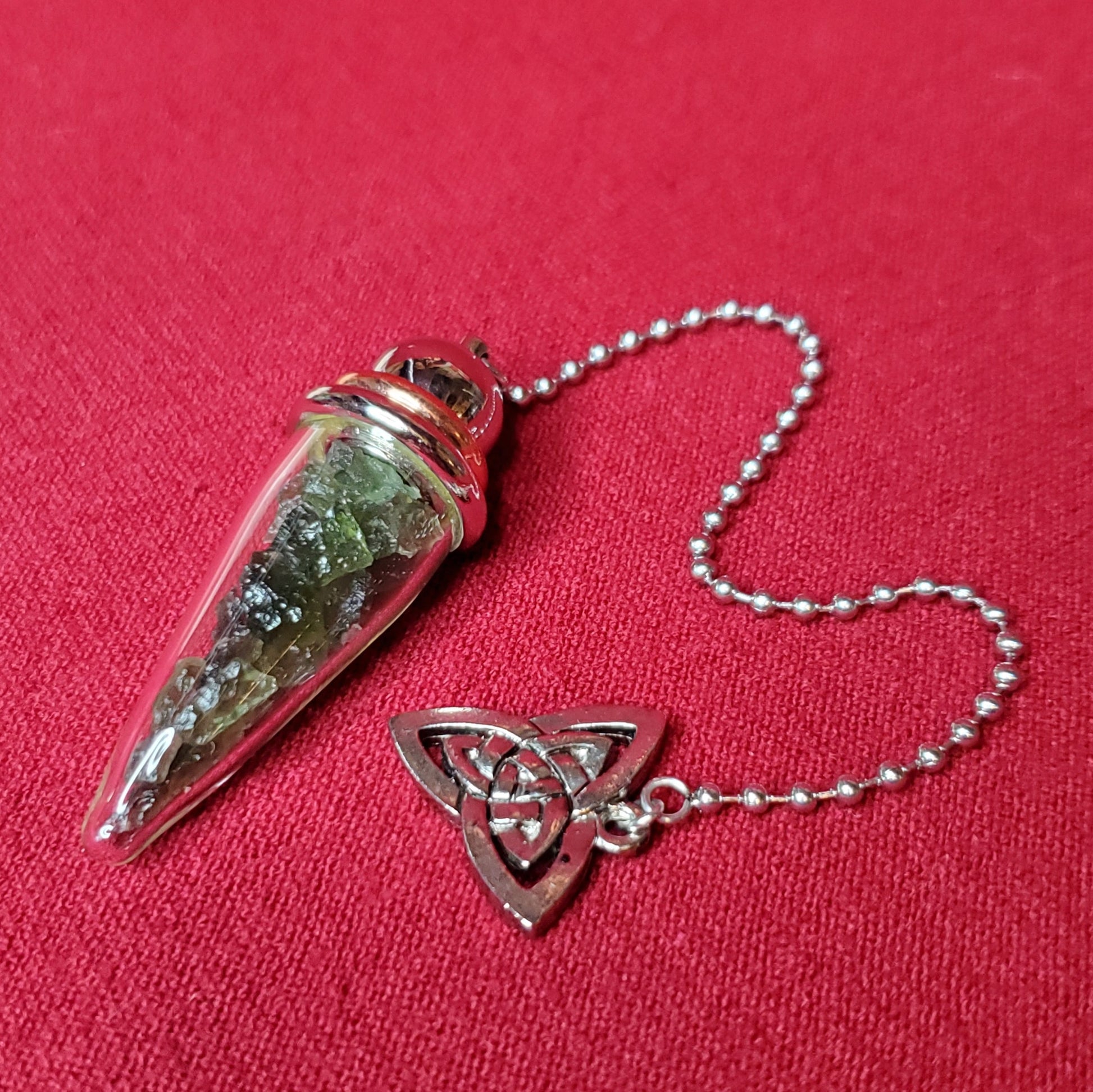 Carefully selected Moldavite specimens inside of a Pyrex chamber pendulum topped with a Triquetra (the Celtic symbol representing the Holy Trinity: mind, body, spirit/mother, maiden, crone). Moldavite is one of the highest frequency gemstones we have access to though, technically it is not a stone of this Earth. Moldavite was formed more than 14 million years ago when a giant meteor struck Germany and showered the Czech Republic with its debris field, thus creating this otherworldly green gem. Very powerful for enhancing all manner of healing, psychic abilities, channeling and esp. Also a powerful stone for manifestation and raising our spiritual vibrations