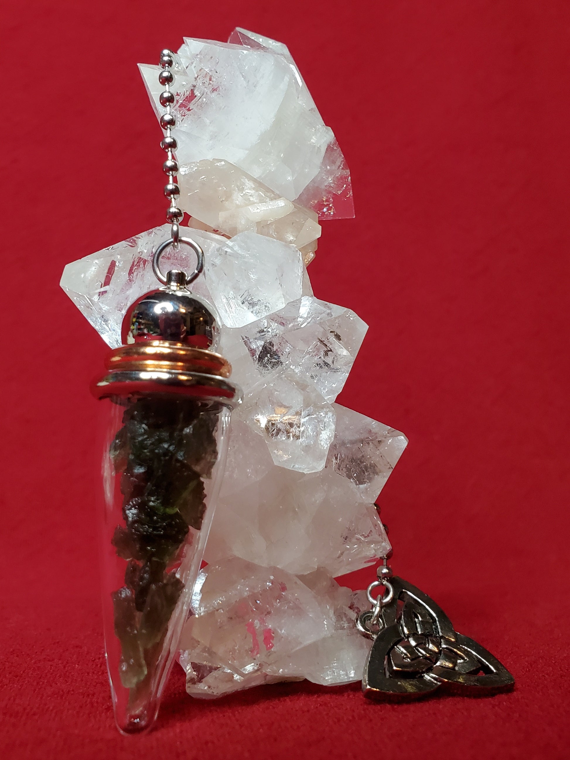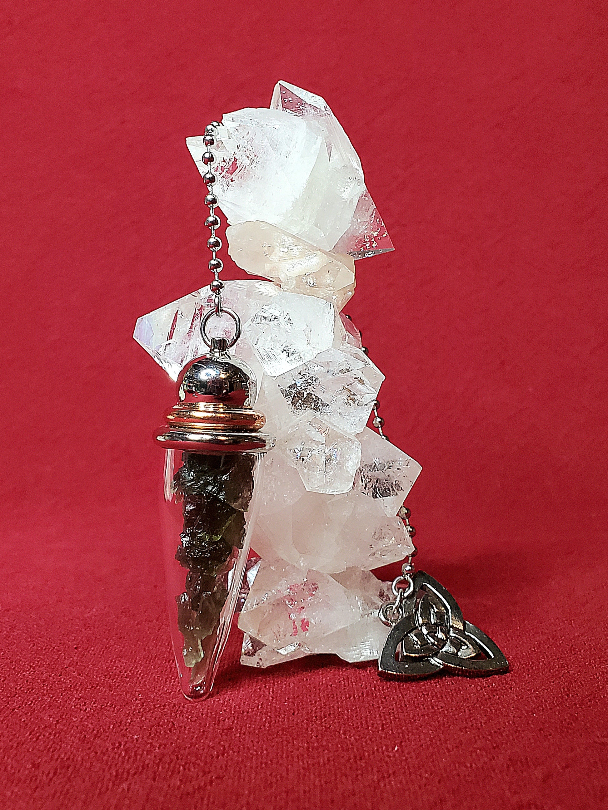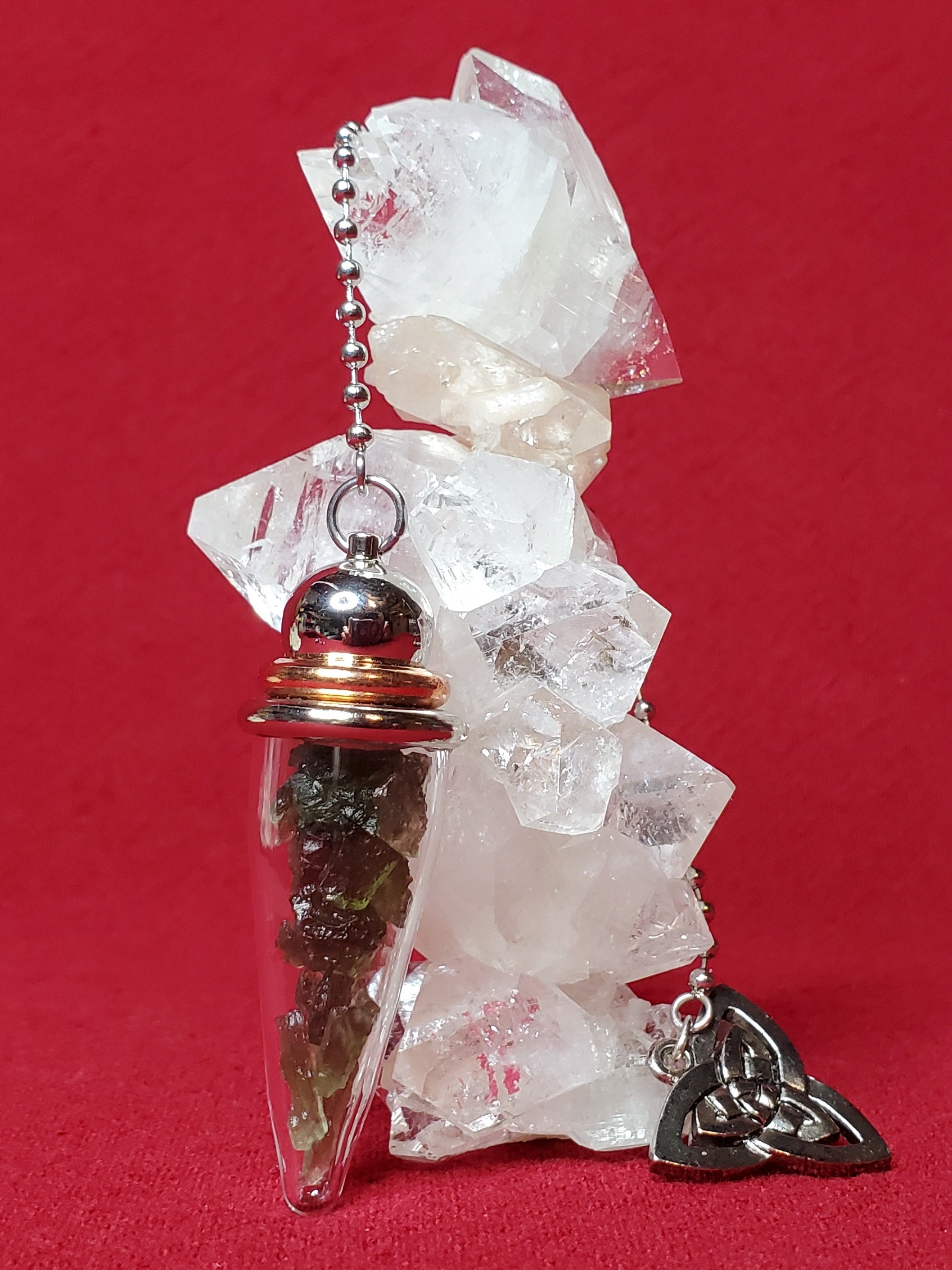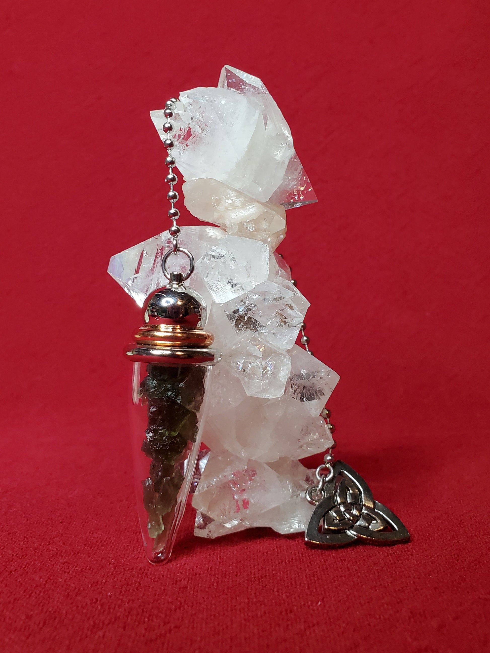 Carefully selected Moldavite specimens inside of a Pyrex chamber pendulum topped with a Triquetra (the Celtic symbol representing the Holy Trinity: mind, body, spirit/mother, maiden, crone). Moldavite is one of the highest frequency gemstones we have access to though, technically it is not a stone of this Earth. Moldavite was formed more than 14 million years ago when a giant meteor struck Germany and showered the Czech Republic with its debris field, thus creating this otherworldly green gem. Very powerful for enhancing all manner of healing, psychic abilities, channeling and esp. Also a powerful stone for manifestation and raising our spiritual vibrations