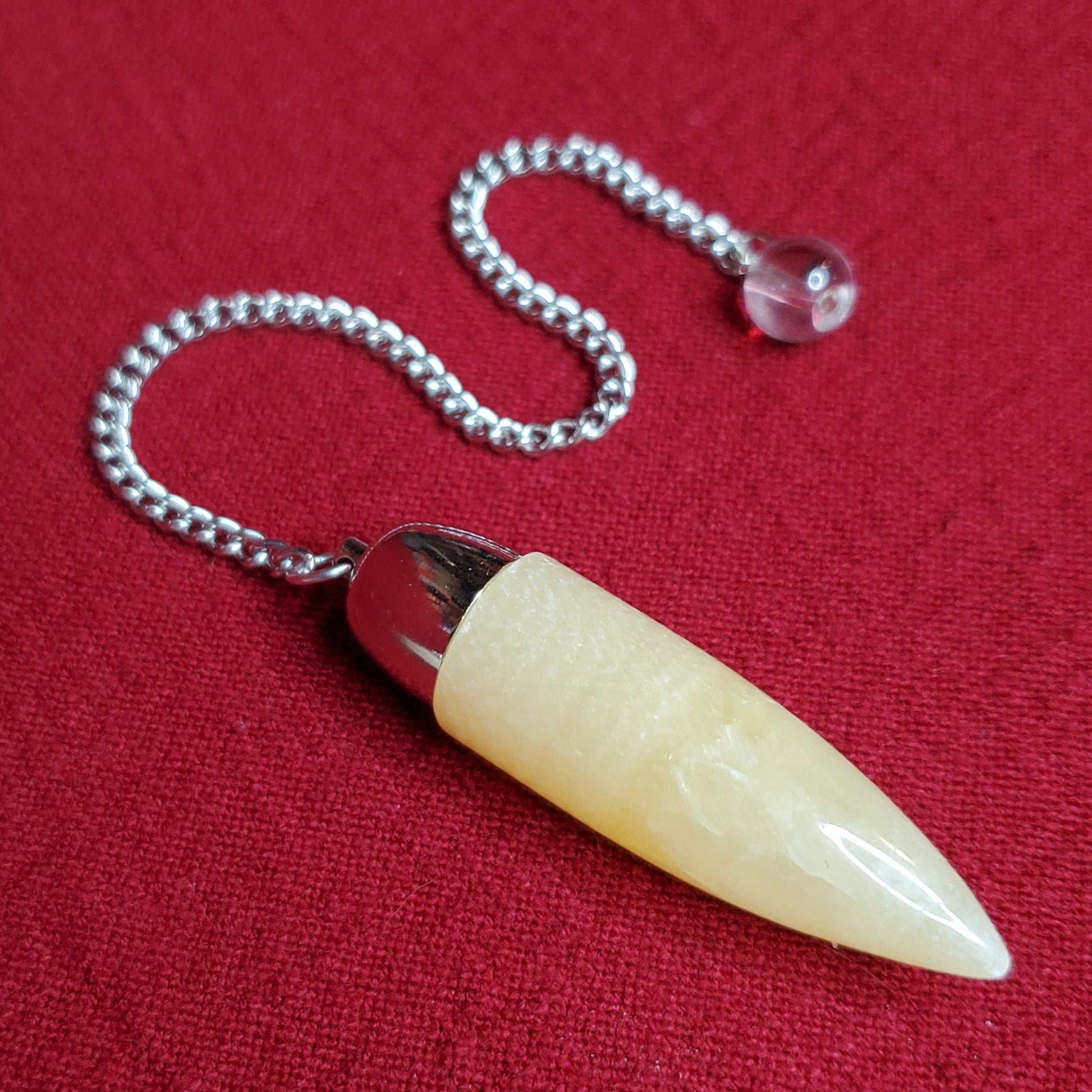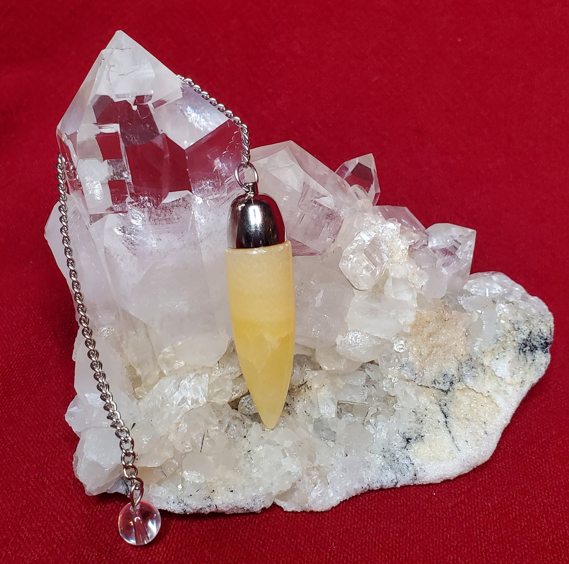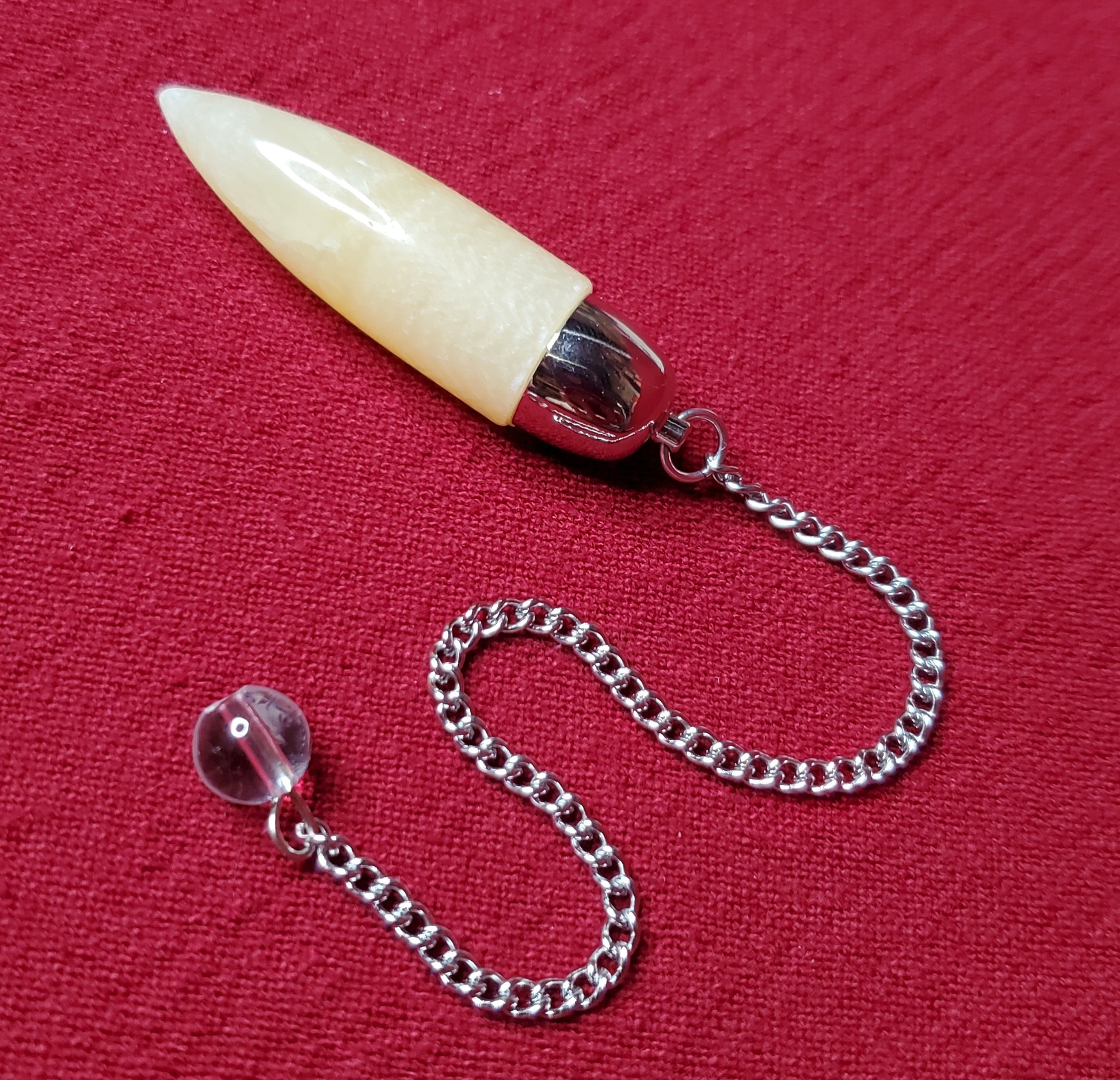 Yellow Jade topped with a surgical grade stainless steel dome and sgss chain. Perfectly balanced and weighted. This gemstone represents abundance, prosperity and manifestation. Great for good luck!
